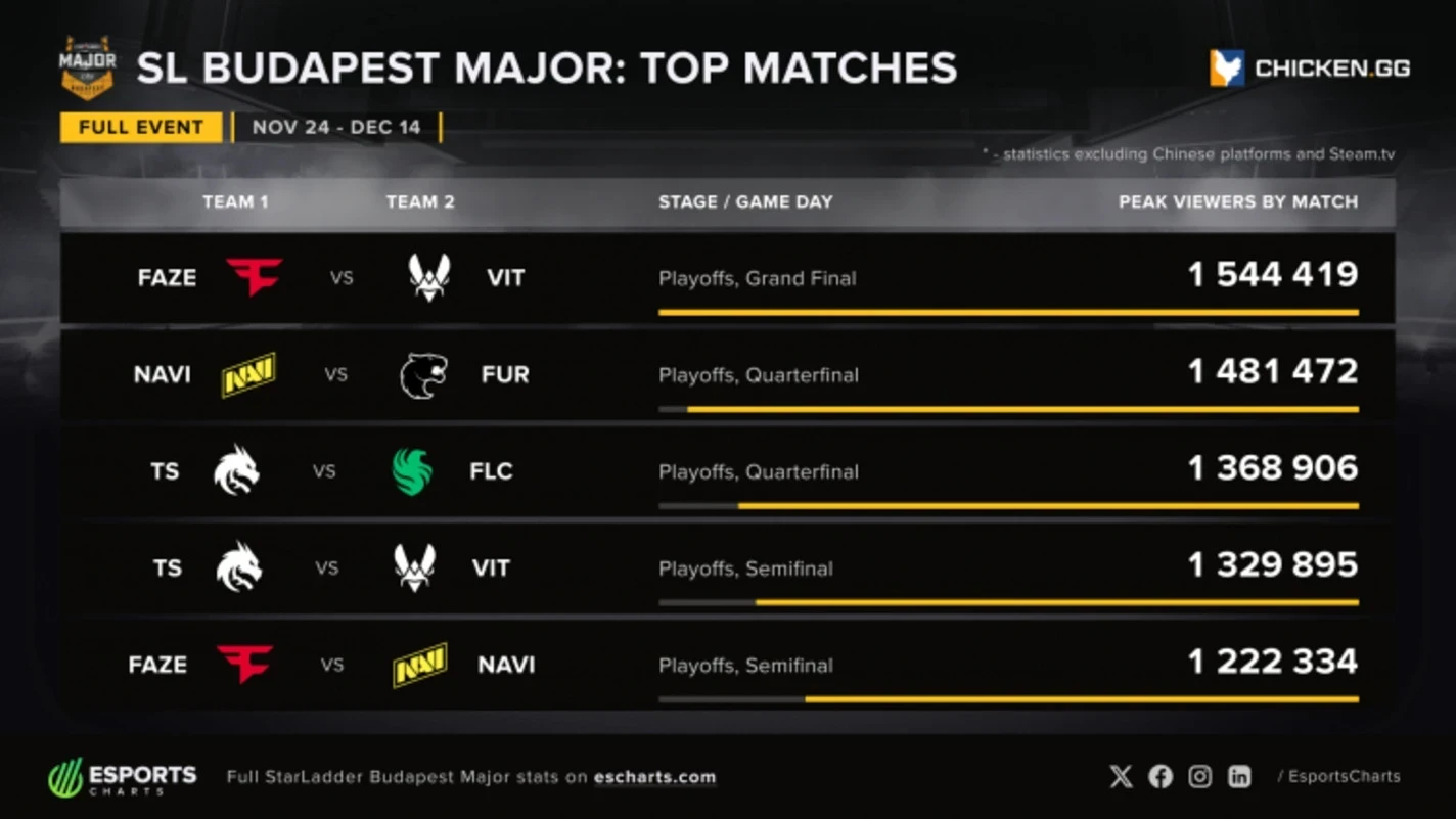 Наибольший ажиотаж вызвал решающий поединок за титул между Team Vitality и FaZe Clan — именно он стал самым популярным матчем ивента. Также в тройку лидеров по просмотрам вошли четвертьфинальные встречи с участием медийных команд: NAVI, FURIA, Team Spirit и Falcons.