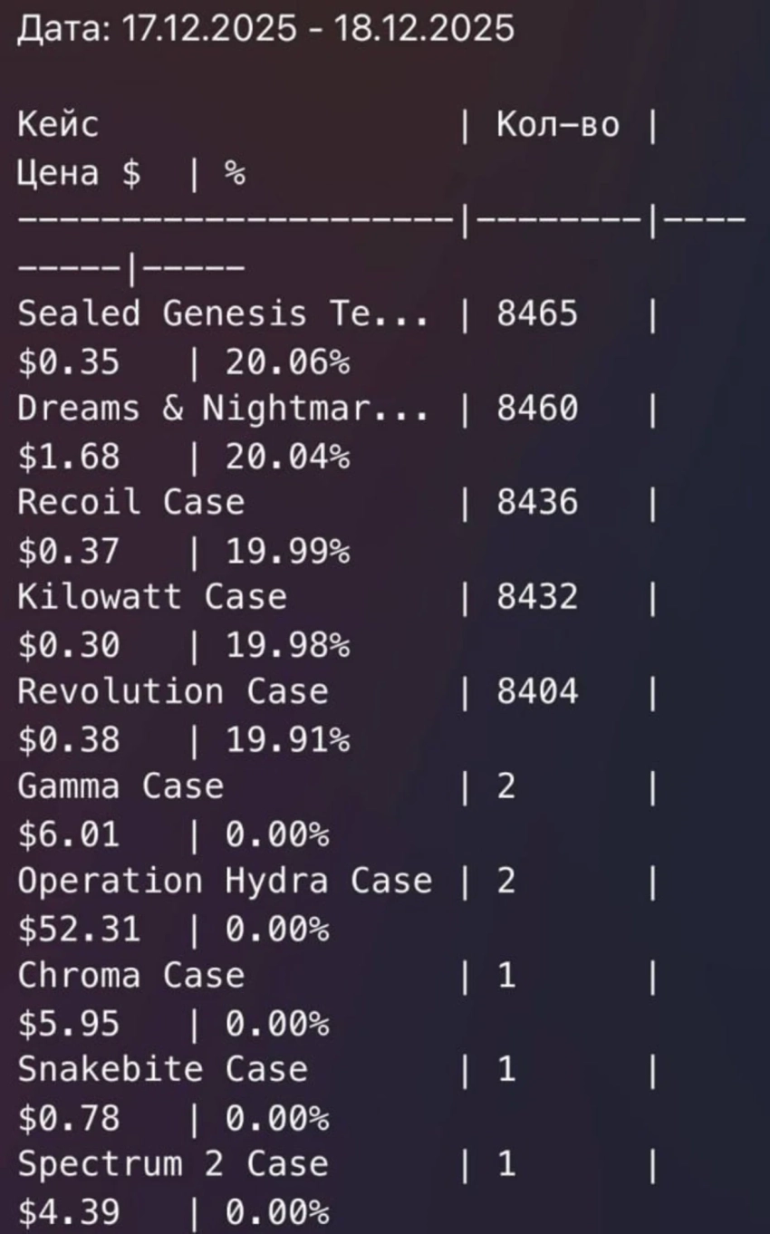 Подозрения возникли после анализа статистики выпадения предметов. Владельцы «ферм» аккаунтов заметили резкое снижение частоты получения Gamma Case, Chrome Case и Operation Hydra Case. За два дня наблюдения эти предметы выпали всего 1-2 раза, в то время как количество выпавших дешевых кейсов превысило восемь тысяч.