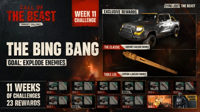 Для того, чтобы получить новый раскрас для автомобиля, геймерам необходимо взорвать 1,5 млн врагов. А за преодоление отметки в четыре миллиона разработчики откроют новое оружие ближнего боя — ножку от стола. 11-я неделя испытаний уже началась и продлится до 7 января. Все награды, как обычно, будут отправлены в тайник главного героя.