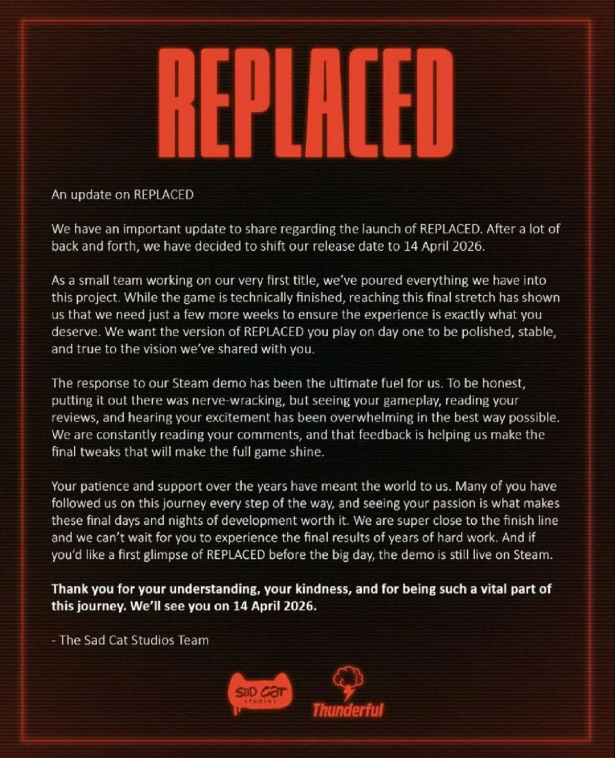 «Многие из вас следовали за нами на каждом шагу этого путешествия, и видеть вашу страсть — это то, что делает нас счастливыми. Эти последние дни и ночи разработки стоят того. Мы очень близки к финишу и с нетерпением ждём, когда вы сможете ощутить окончательные результаты многолетней напряжённой работы. И если вы хотите ознакомиться с Replaced до релиза, демоверсия всё ещё доступна в Steam», — поделились разработчики.