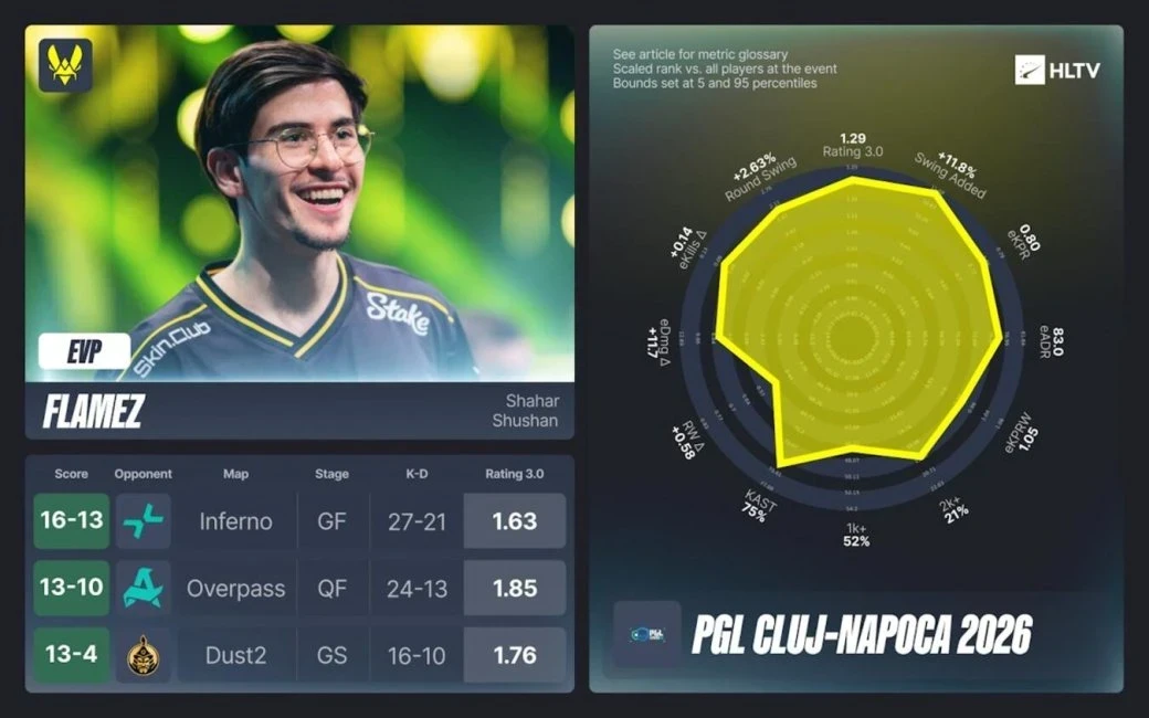 Источник: HLTVАвторитетный киберспортивный портал HLTV подвел финальные индивидуальные итоги завершившегося в Румынии чемпионата PGL Cluj-Napoca 2026 по Counter-Strike 2. Журналисты детально проанализировали статистику выступлений и опубликовали списки самых ценных игроков ивента на каждой позиции.