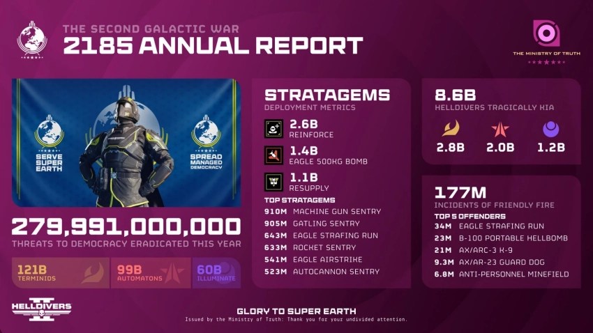 В Helldivers 2 есть обширный арсенал, который также не могли обойти стороной в отчёте Министерства правды. Самой популярной стратагемой оказалась Reinforce — возрождение союзников использовали 2,6 млрд раз. При этом 1,4 млрд раз бойцы вызывали на подмогу сброс 500-килограммовых бомб.
