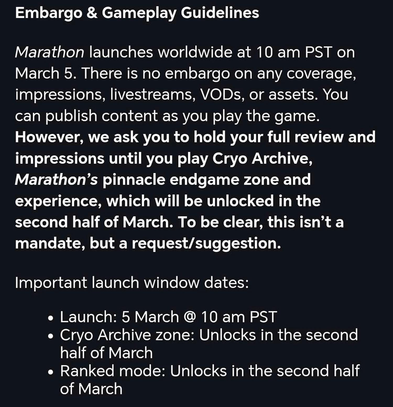 В нём Bungie просит делиться обзорами Marathon после того, как обзорщики опробуют Криоархив. Зону называют «вершиной эндгейм-игры», а выходит она во второй половине марта.
