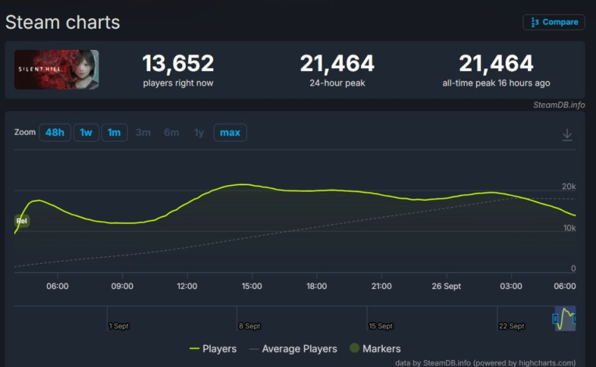 Новинке так и не удалось обойти ремейк Silent Hill 2, которая в своё время достигла 23 676 игроков одновременно. Возможно, ситуация изменится на грядущих выходных.