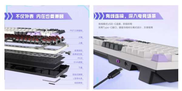 Для повышения комфорта клавиатура оснащена подушечкой из ЭВА в нижней части и силиконовыми демпфирующими полосками по обе стороны от клавиши пробела, устраняющими звук, издаваемый внутренними полостями. Кроме того, T96 имеет металлическую установочную пластину для дополнительной стабильности и интерфейс USB-C.